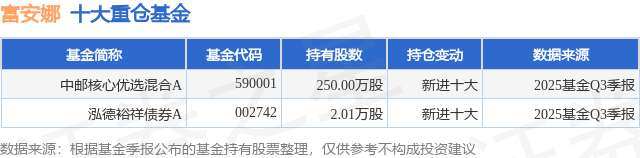 根据2025基金Q3季报公募基金重仓股数据,重仓该股的公募基金共2家,其中持有数量最多的公募基金为中邮基金的中邮核心优选混合A。中邮核心优选混合A目前规模为7.99亿元,最新净值0.9657(12月10日),较上一交易日下跌0.57%,近一年上涨2.47%。该公募基金现任基金经理为陈梁 王高。陈梁在任的基金产品包括:中邮核心主题混合A,管理时间为2015年3月13日至今,期间收益率为16.64%;中邮核心成长混合A,管理时间为2021年11月22日至今,期间收益率为-48.09%;中邮能源革新混合型发起A,管理时间为2025年11月20日至今,期间收益率为-8.92%。王高在任的基金产品包括:中邮中证500指数增强A,管理时间为2020年7月8日至今,期间收益率为16.48%;中邮军民融合灵活配置混合A,管理时间为2023年12月11日至今,期间收益率为34.47%;中邮新锐量化选股混合发起式A,管理时间为2025年11月4日至今,期间收益率为-0.8%。