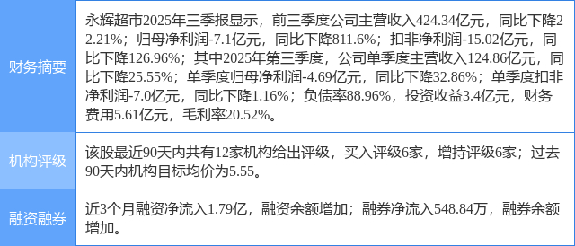 2025年11月6日,开源证券研究员黄泽鹏,姚慕宇发布了对永辉超市的研报《公司信息更新报告:2025Q3经营业绩短期承压,门店调改加速推进》,该研报对永辉超市给出“买入”评级。研报中预计2025-2027年归母净利润为-7.38/4.10/11.95亿元,对应EPS为-0.08/0.05/0.13元,当前股价对应2026-2027年PE为103.1/35.4倍。我们认为,公司向品质零售转型进展顺利,目前处于供应链改革和门店优化转型期,短期业绩有所承压,但长期经营拐点可期,维持“买入”评级。证券之星数据中心根据近三年发布的研报数据计算,该研报作者对此股的盈利预测准确度为6.8%。