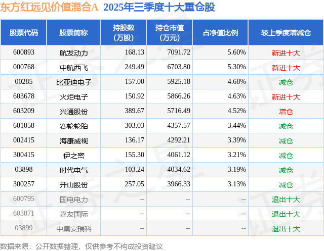 东方红远见价值混合A的前十大重仓股如下: