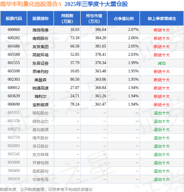 根据2025基金Q3季报公募基金重仓股数据,重仓该股的公募基金共2家,其中持有数量最多的公募基金为南华基金的南华丰利量化选股混合A。南华丰利量化选股混合A目前规模为0.38亿元,最新净值1.1146(12月10日),较上一交易日上涨0.32%。该公募基金现任基金经理为黄志钢 康冬。黄志钢在任的基金产品包括:南华丰汇混合A,管理时间为2022年3月5日至今,期间收益率为86.25%;南华丰元量化选股混合A,管理时间为2024年1月23日至今,期间收益率为39.34%;南华丰睿量化选股混合A,管理时间为2024年11月5日至今,期间收益率为17.57%;康冬在任的基金产品包括:南华中证杭州湾区ETF联接A,管理时间为2023年8月30日至今,期间收益率为6.35%;南华中证杭州湾区ETF,管理时间为2023年8月30日至今,期间收益率为6.78%;南华丰元量化选股混合A,管理时间为2024年11月9日至今,期间收益率为17.59%;