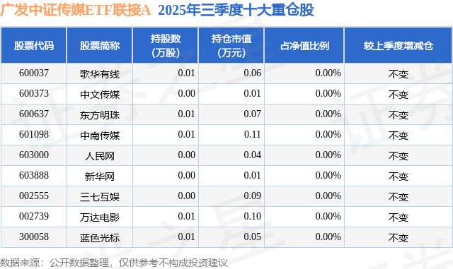 根据2025基金Q3季报公募基金重仓股数据,重仓该股的公募基金共1家,其中持有数量最多的公募基金为广发基金的广发中证传媒ETF联接A。广发中证传媒ETF联接A目前规模为6.25亿元,最新净值0.9769(12月10日),较上一交易日上涨0.8%,近一年上涨11.19%。该公募基金现任基金经理为罗国庆。罗国庆在任的基金产品包括:广发中证传媒ETF,管理时间为2017年12月27日至今,期间收益率为-3.99%;广发中证A100ETF联接A,管理时间为2019年5月27日至今,期间收益率为36.34%;广发中证创新药产业ETF,管理时间为2020年12月3日至今,期间收益率为-34.97%。