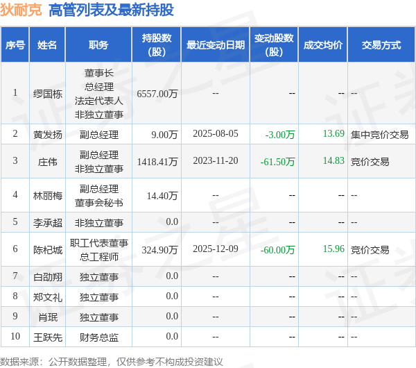 狄耐克近半年内的董监高及核心技术人员增减持详情如下: