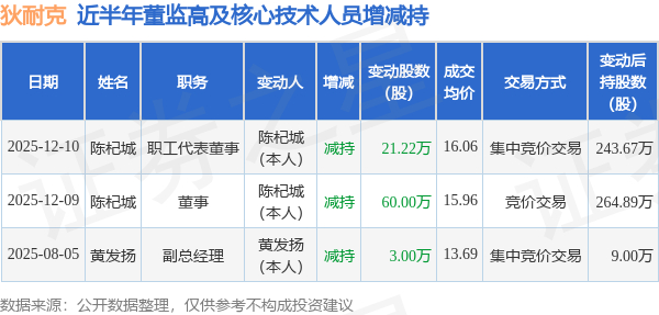 证券之星消息,根据12月11日市场公开信息、上市公司公告及交易所披露数据整理,狄耐克(300884)最新董监高及相关人员股份变动情况:2025年12月10日公司职工代表董事陈杞城共减持公司股份21.22万股,占公司总股本为0.0836%。变动期间公司股价下跌0.81%,12月10日当日收盘报15.93元。