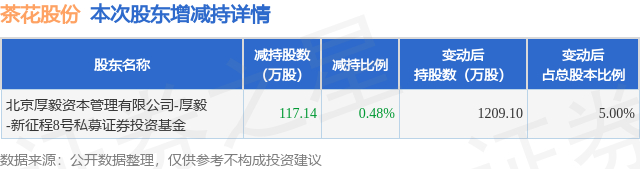 证券之星消息,12月11日茶花股份发布公告《茶花股份:简式权益变动报告书(厚毅-新征程8号私募证券投资基金)》,其股东北京厚毅资本管理有限公司-厚毅-新征程8号私募证券投资基金于2025年12月9日至2025年12月11日间合计减持117.14万股,占公司目前总股本的0.4844%,变动期间该股股价下跌2.86%,截止12月11日收盘报23.13元。