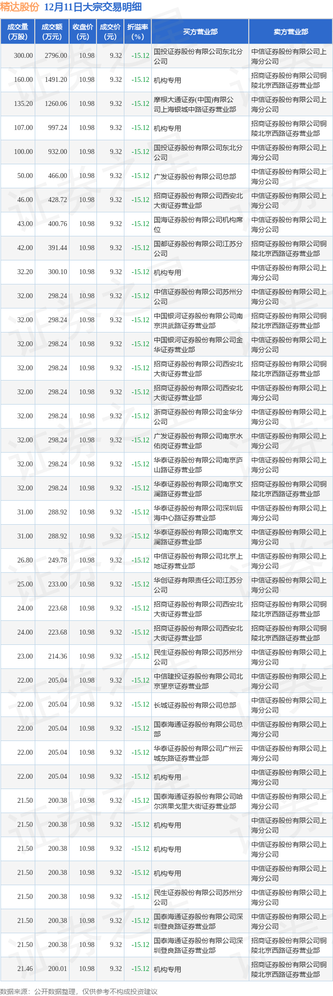 证券之星消息,12月11日精达股份发生大宗交易,交易数据如下: