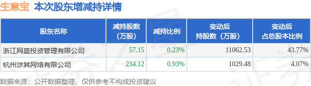 证券之星消息,12月11日生意宝发布公告《生意宝:关于原持股5%以上股东减持计划期限届满暨实施完成的公告》,其股东杭州涉其网络有限公司、浙江网盛投资管理有限公司于2025年9月30日至2025年12月11日间合计减持291.27万股,占公司目前总股本的1.1525%,变动期间该股股价下跌11.11%,截止12月11日收盘报17.28元。