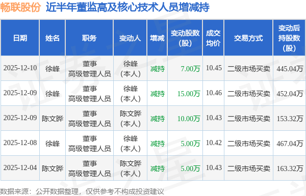 证券之星消息,根据12月11日市场公开信息、上市公司公告及交易所披露数据整理,畅联股份(603648)最新董监高及相关人员股份变动情况:2025年12月10日公司董事,高级管理人员徐峰共减持公司股份7.0万股,占公司总股本为0.0193%。变动期间公司股价上涨0.48%,12月10日当日收盘报10.47元。