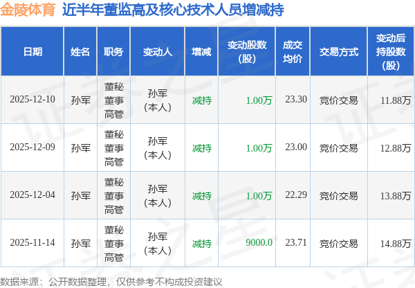 证券之星消息,根据12月11日市场公开信息、上市公司公告及交易所披露数据整理,金陵体育(300651)最新董监高及相关人员股份变动情况:2025年12月10日公司董秘,董事,高管孙军共减持公司股份1.0万股,占公司总股本为0.0071%。变动期间公司股价上涨2.85%,12月10日当日收盘报23.42元。