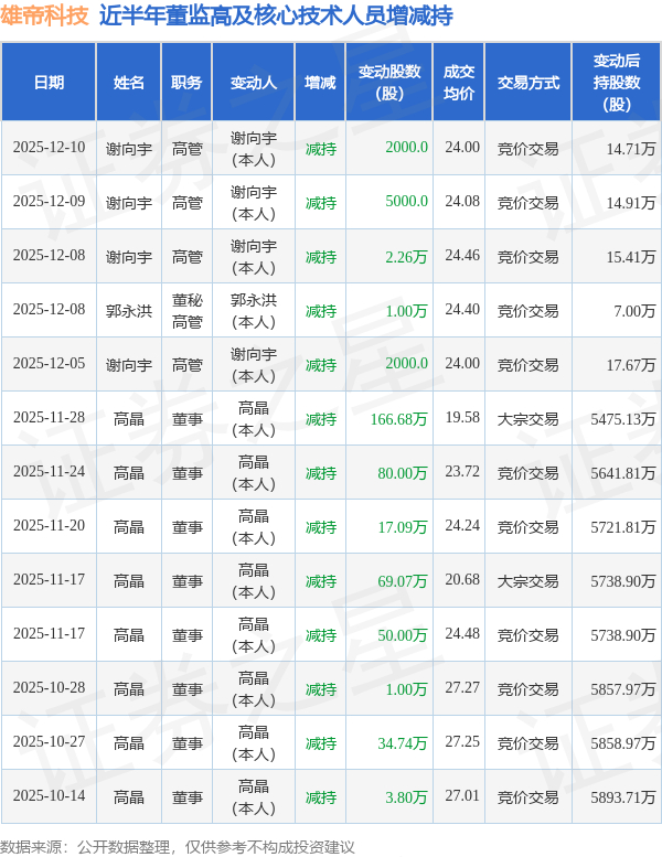 雄帝科技近半年内的董监高及核心技术人员增减持详情如下: