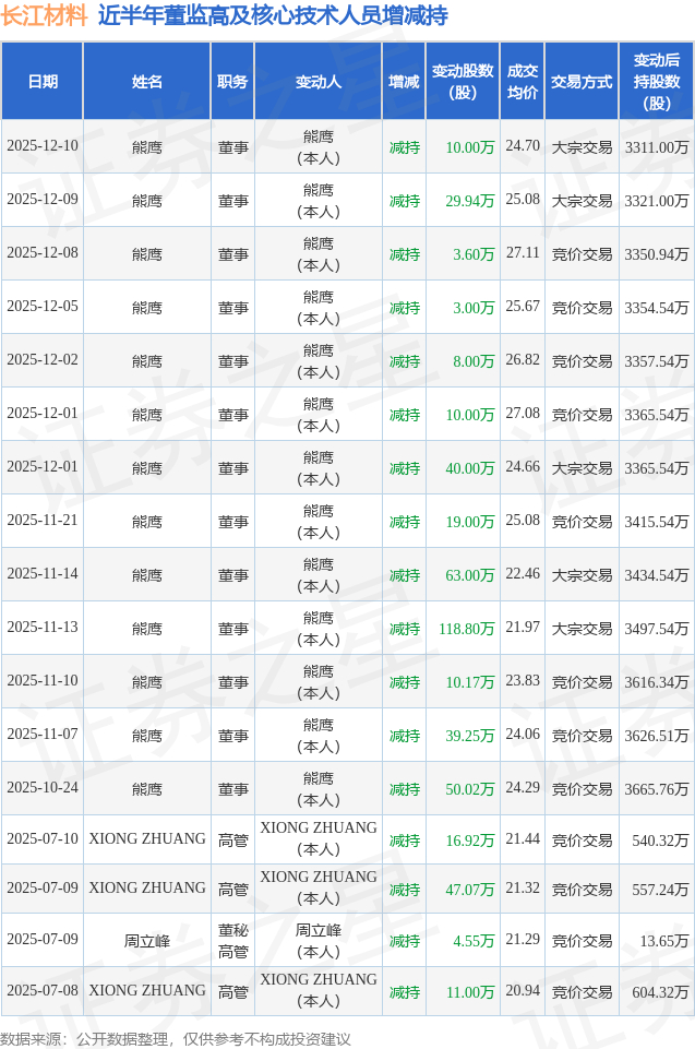 长江材料近半年内的董监高及核心技术人员增减持详情如下: