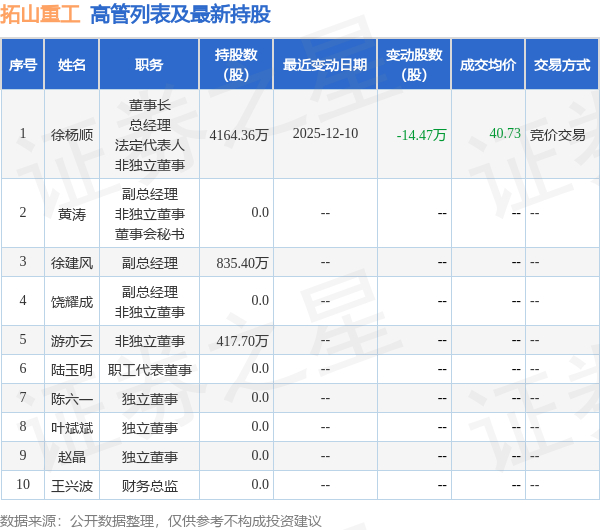 拓山重工近半年内的董监高及核心技术人员增减持详情如下:
