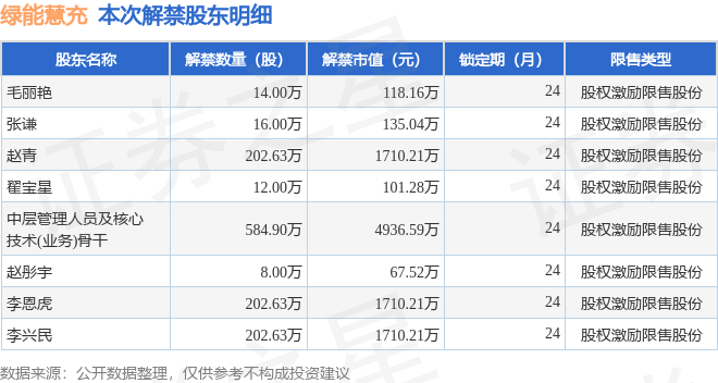 证券之星消息,根据市场公开信息整理,绿能慧充(600212)于12月12日将有1242.8万股限售股份解禁,为公司股权激励限售股份,占公司总股本1.76%。(本次数据根据历史公告整理得出,实际情况以上市公司最新公告为准)最近一年内,该股累计解禁312.0万股,占总股本的0.44%。本次解禁后,公司还有1.77亿股限售股份,占总股本25.14%。具体如下图所示: