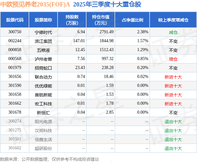 中欧预见养老2035(FOF)A的前十大重仓股如下: