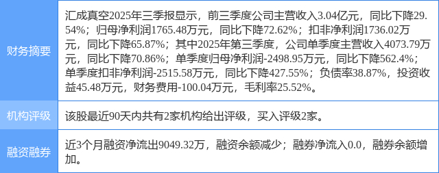 2025年10月30日,国金证券研究员樊志远,周焕博发布了对汇成真空的研报《合同负债增加,静待下游爆发》,该研报对汇成真空给出“买入”评级。研报中预计公司2025-27年营收6.75/8.76/10.88亿元,同比增长29.77%/29.73%/24.18%;归母净利润0.95/1.32/1.82亿元,同比增长39.16%/39.79%/37.54%,对应EPS为0.9/1.3/1.8元,对应P/E为152/108/79倍,维持“买入”评级。证券之星数据中心根据近三年发布的研报数据计算,该研报作者对此股的盈利预测准确度为71.88%。