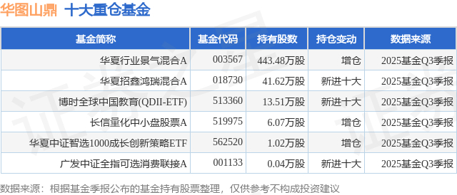 根据2025基金Q3季报公募基金重仓股数据,重仓该股的公募基金共6家,其中持有数量最多的公募基金为华夏基金的华夏行业景气混合A。华夏行业景气混合A目前规模为89.72亿元,最新净值4.7589(12月11日),较上一交易日下跌0.85%,近一年上涨48.31%。该公募基金现任基金经理为钟帅。钟帅在任的基金产品包括:华夏远见成长一年持有混合A,管理时间为2022年9月20日至今,期间收益率为36.46%;华夏招鑫鸿瑞混合A,管理时间为2024年1月16日至今,期间收益率为109.63%;华夏卓越成长混合A,管理时间为2025年8月12日至今,期间收益率为15.57%。