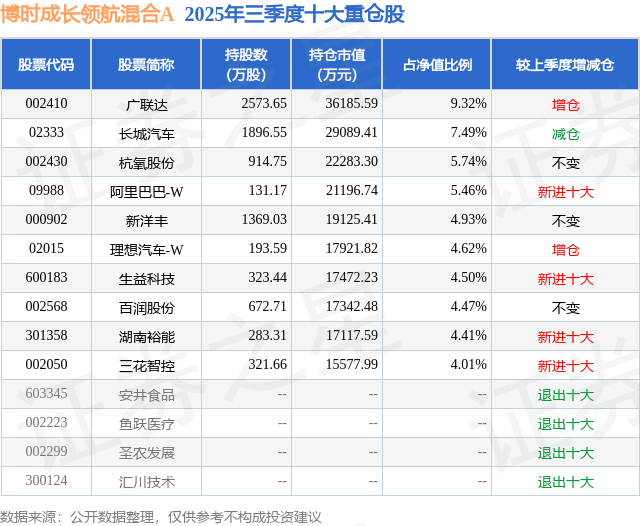 根据2025基金Q3季报公募基金重仓股数据,重仓该股的公募基金共9家,其中持有数量最多的公募基金为博时基金的博时成长领航混合A。博时成长领航混合A目前规模为33.93亿元,最新净值0.8006(12月11日),较上一交易日下跌0.77%,近一年上涨11.8%。该公募基金现任基金经理为陈鹏扬 郭康斌。陈鹏扬在任的基金产品包括:博时裕隆灵活配置混合A,管理时间为2015年8月24日至今,期间收益率为204.71%;博时成长优势混合A,管理时间为2021年8月3日至今,期间收益率为-3.37%;博时成长臻选混合A,管理时间为2022年1月25日至今,期间收益率为30.19%。郭康斌在任的基金产品包括:博时价值臻选持有期混合A,管理时间为2022年2月23日至今,期间收益率为-6.39%;