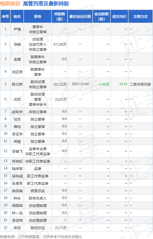 证券之星消息,根据12月12日市场公开信息、上市公司公告及交易所披露数据整理,畅联股份(603648)最新董监高及相关人员股份变动情况:2025年12月11日公司董事,高级管理人员徐峰、董事,高级管理人员陈文晔共减持公司股份13.0万股,占公司总股本为0.0359%。变动期间公司股价下跌1.53%,12月11日当日收盘报10.31元。