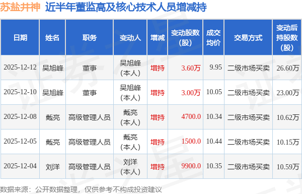 证券之星消息,根据12月12日市场公开信息、上市公司公告及交易所披露数据整理,苏盐井神(603299)最新董监高及相关人员股份变动情况:2025年12月10日至2025年12月12日公司董事吴旭峰共增持公司股份6.6万股,占公司总股本为0.0084%。变动期间公司股价下跌1.86%,12月12日当日收盘报10.0元。