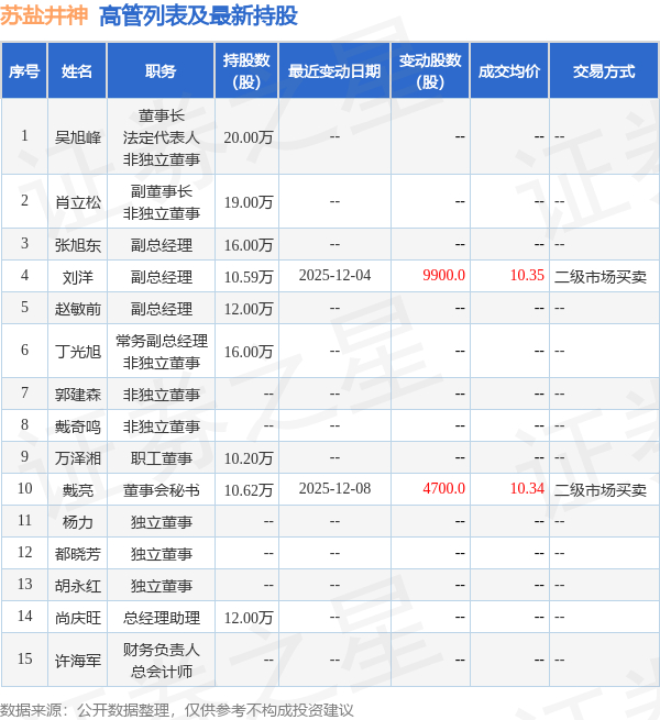 苏盐井神的高管列表及最新持股情况如下: