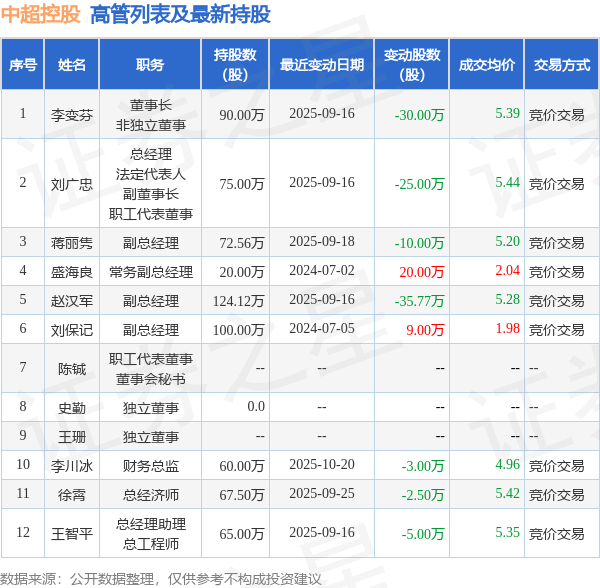 中超控股近半年内的董监高及核心技术人员增减持详情如下: