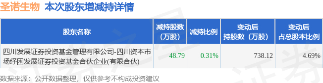 证券之星消息,12月14日圣诺生物发布公告《圣诺生物:关于持股5%以上股东及部分董事、高级管理人员减持股份结果公告》,其股东四川发展证券投资基金管理有限公司-四川资本市场纾困发展证券投资基金合伙企业(有限合伙)于2025年12月11日至2025年12月12日间合计减持48.79万股,占公司目前总股本的0.31%,变动期间该股股价上涨0.6%,截止12月12日收盘报41.69元。