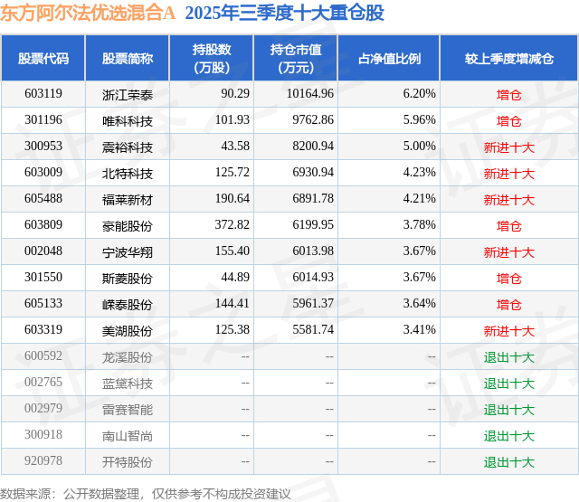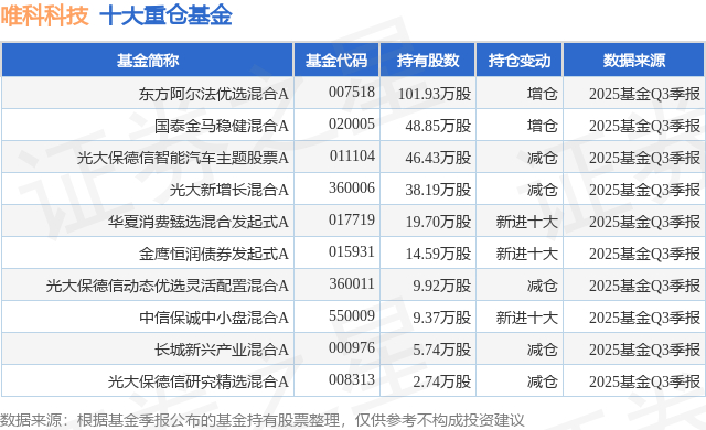 根据2025基金Q3季报公募基金重仓股数据,重仓该股的公募基金共19家,其中持有数量最多的公募基金为东方阿尔法基金的东方阿尔法优选混合A。东方阿尔法优选混合A目前规模为1.28亿元,最新净值1.0583(12月12日),较上一交易日下跌1.01%,近一年上涨41.71%。该公募基金现任基金经理为周谧。周谧在任的基金产品包括:东方阿尔法科技优选混合发起A,管理时间为2025年6月12日至今,期间收益率为2.76%;东方阿尔法产业先锋混合A,管理时间为2025年7月1日至今,期间收益率为36.39%;东方阿尔法优势产业混合A,管理时间为2025年11月5日至今,期间收益率为11.3%。