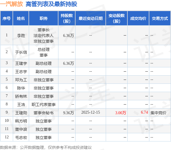 证券之星消息,根据12月15日市场公开信息、上市公司公告及交易所披露数据整理,一汽解放(000800)最新董监高及相关人员股份变动情况:2025年12月15日公司董事会秘书王建勋共增持公司股份3.0万股,占公司总股本为0.0006%。变动期间公司股价下跌1.46%,12月15日当日收盘报6.73元。