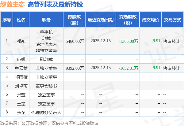 绿茵生态的高管列表及最新持股情况如下:
