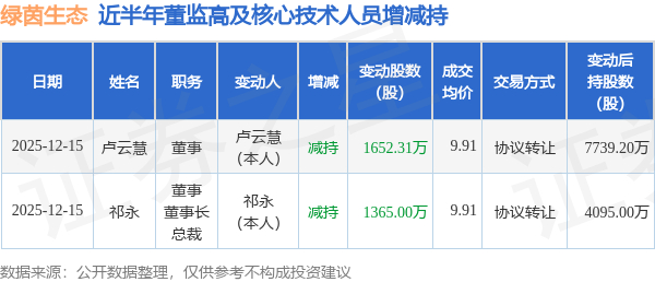 证券之星消息,根据12月15日市场公开信息、上市公司公告及交易所披露数据整理,绿茵生态(002887)最新董监高及相关人员股份变动情况:2025年12月15日公司董事,董事长,总裁祁永、董事卢云慧共减持公司股份3017.31万股,占公司总股本为9.8609%。变动期间公司股价上涨1.23%,12月15日当日收盘报9.04元。