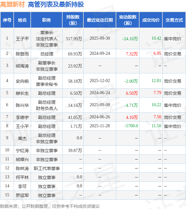 高盟新材的高管列表及最新持股情况如下: