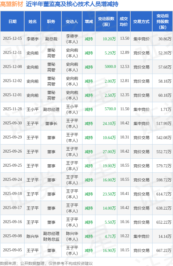 高盟新材近半年内的董监高及核心技术人员增减持详情如下: