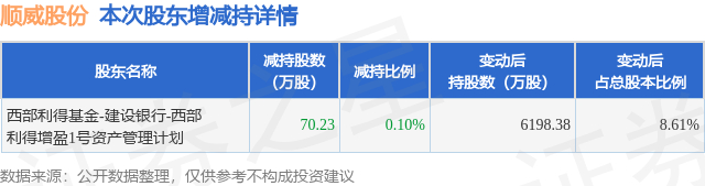 证券之星消息,12月15日顺威股份发布公告《顺威股份:关于持股5%以上股东减持股份计划期限届满暨实施情况的公告》,其股东西部利得基金-建设银行-西部利得增盈1号资产管理计划于2025年9月15日合计减持70.23万股,占公司目前总股本的0.0975%,变动期间该股股价下跌2.65%,截止9月15日收盘报10.3元。