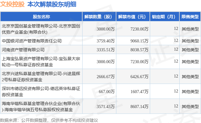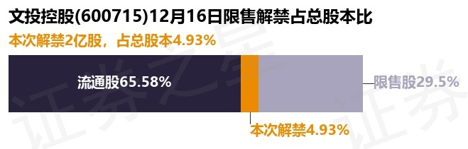 证券之星消息,根据市场公开信息整理,文投控股(600715)于12月16日将有2.0亿股限售股份解禁,为公司其他类型,占公司总股本4.93%。(本次数据根据历史公告整理得出,实际情况以上市公司最新公告为准)本次解禁后,公司还有11.97亿股限售股份,占总股本29.5%。具体如下图所示: