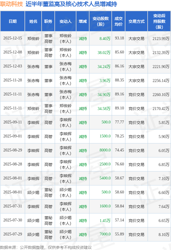 联动科技近半年内的董监高及核心技术人员增减持详情如下: