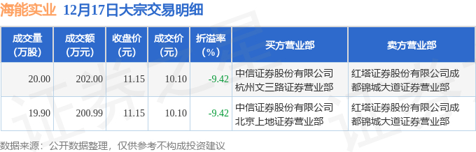 证券之星消息,12月17日海能实业发生大宗交易,交易数据如下: