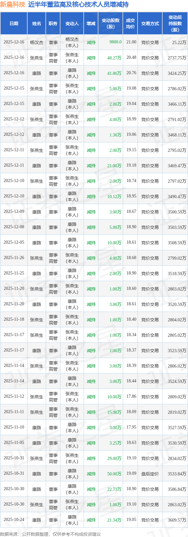 新晨科技近半年内的董监高及核心技术人员增减持详情如下: