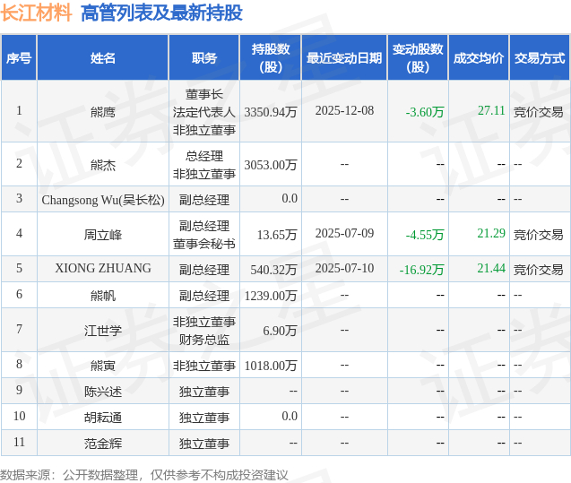 长江材料近半年内的董监高及核心技术人员增减持详情如下: