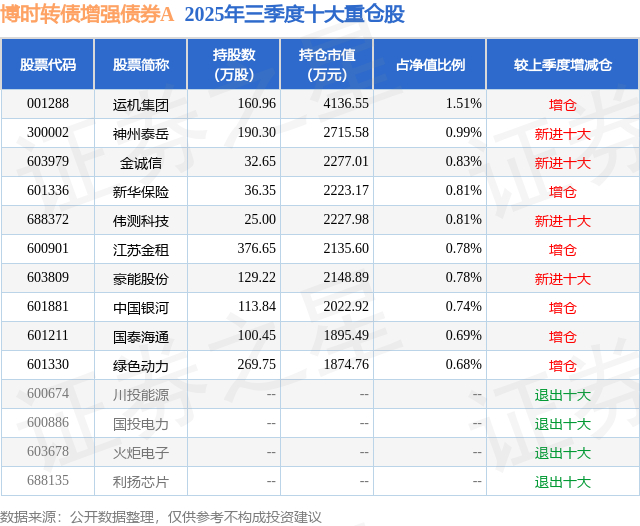 根据2025基金Q3季报公募基金重仓股数据,重仓该股的公募基金共10家,其中持有数量最多的公募基金为博时基金的博时转债增强债券A。博时转债增强债券A目前规模为12.13亿元,最新净值2.2411(12月17日),较上一交易日上涨1.72%,近一年上涨29.2%。该公募基金现任基金经理为过钧 高晖。过钧在任的基金产品包括:博时信用债券A/B,管理时间为2009年6月10日至今,期间收益率为300.25%;博时新收益A,管理时间为2016年2月29日至今,期间收益率为205.78%;博时双季鑫6个月持有混合A,管理时间为2021年1月20日至今,期间收益率为11.01%;博时浦惠一年持有期混合A,管理时间为2022年2月17日至今,期间收益率为16.79%。高晖在任的基金产品包括:博时稳健回报债券(LOF)C,管理时间为2023年10月20日至今,期间收益率为10.02%;博时可转债ETF,管理时间为2023年10月20日至今,期间收益率为21.64%。