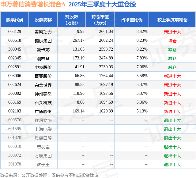 根据2025基金Q3季报公募基金重仓股数据,重仓该股的公募基金共1家,其中持有数量最多的公募基金为申万菱信基金的申万菱信消费增长混合A。申万菱信消费增长混合A目前规模为1.42亿元,最新净值1.413(12月17日),较上一交易日上涨1.22%,近一年上涨21.39%。该公募基金现任基金经理为刘含。刘含在任的基金产品包括:申万菱信乐融一年持有混合A,管理时间为2023年11月29日至今,期间收益率为40.45%。