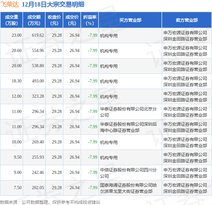 证券之星消息,12月18日飞荣达发生大宗交易,交易数据如下: