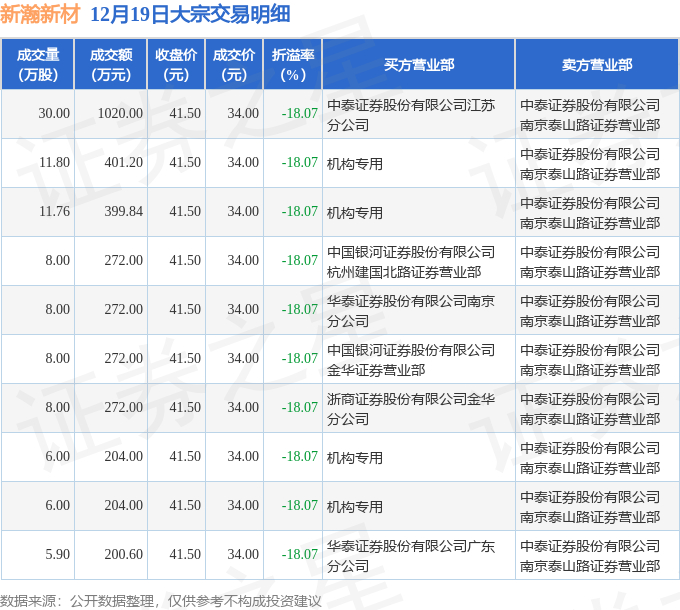 证券之星消息,12月19日新瀚新材发生大宗交易,交易数据如下: