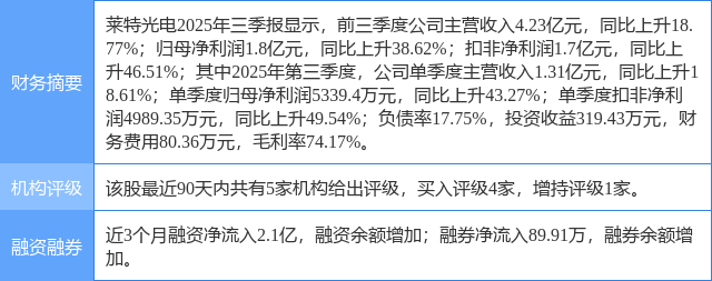 2025年10月28日,开源证券研究员周佳,赵晨旭发布了对莱特光电的研报《中小盘信息更新:2025Q3业绩延续向好态势,公司降本增效成果显著》,该研报对莱特光电给出“买入”评级。研报中预计2025-2027年归母净利润分别为3.07/4.12/6.09亿元,对应EPS分别为0.76/1.02/1.51元,当前股价对应2025-2027年的PE分别为33.7/25.1/17.0倍,看好公司持续受益于下游OLED市场需求攀升以及未来新产品放量,维持“买入”评级。证券之星数据中心根据近三年发布的研报数据计算,该研报作者对此股的盈利预测准确度为63.18%。