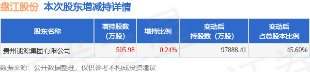 证券之星消息,12月26日盘江股份发布公告《盘江股份:盘江股份关于控股股东增持公司股份计划实施完毕暨增持结果的公告》,其股东贵州能源集团有限公司于2025年6月28日至2025年12月26日间合计增持505.98万股,占公司目前总股本的0.2357%,变动期间该股股价下跌2.47%,截止12月26日收盘报4.74元。