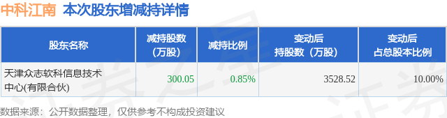 证券之星消息,12月26日中科江南发布公告《中科江南:北京中科江南信息技术股份有限公司简式权益变动报告书》,其股东天津众志软科信息技术中心(有限合伙)于2025年11月28日至2025年12月25日间合计减持300.05万股,占公司目前总股本的0.8504%,变动期间该股股价下跌3.25%,截止12月25日收盘报20.23元。