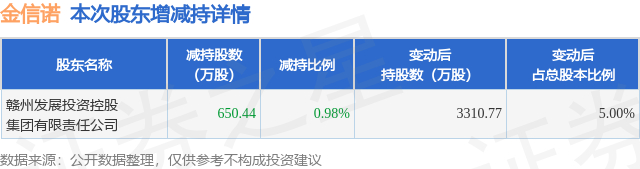证券之星消息,12月29日金信诺发布公告《金信诺:关于持股5%以上股东减持至5%以下暨权益变动及减持计划实施完毕的提示性公告》,其股东赣州发展投资控股集团有限责任公司于2025年10月20日至2025年12月26日间合计减持650.44万股,占公司目前总股本的0.9823%,变动期间该股股价上涨16.99%,截止12月26日收盘报14.6元。