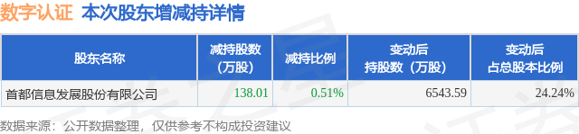 证券之星消息,12月30日数字认证发布公告《数字认证:关于公司大股东减持计划实施完毕的公告》,其股东首都信息发展股份有限公司于2025年12月26日至2025年12月30日间合计减持138.01万股,占公司目前总股本的0.5111%,变动期间该股股价上涨19.09%,截止12月30日收盘报34.99元。