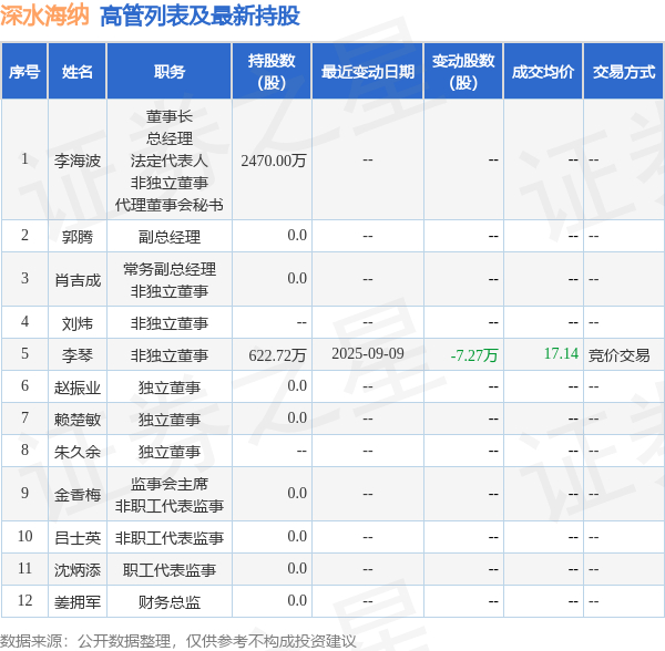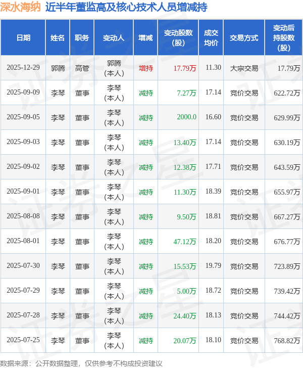 深水海纳近半年内的董监高及核心技术人员增减持详情如下: