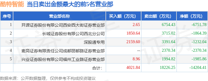 证券之星消息,沪深交易所2025年12月31日公布的交易公开信息显示,酷特智能(300840)因日换手率达到30%的前5只证券登上龙虎榜。此次是近5个交易日内第2次上榜。