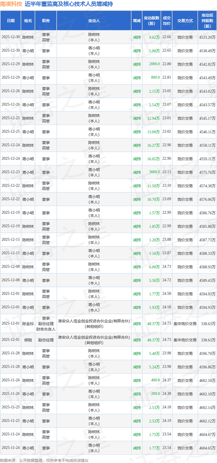 南凌科技近半年内的董监高及核心技术人员增减持详情如下:
