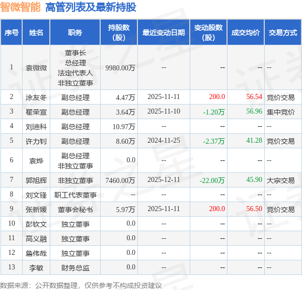 智微智能近半年内的董监高及核心技术人员增减持详情如下: